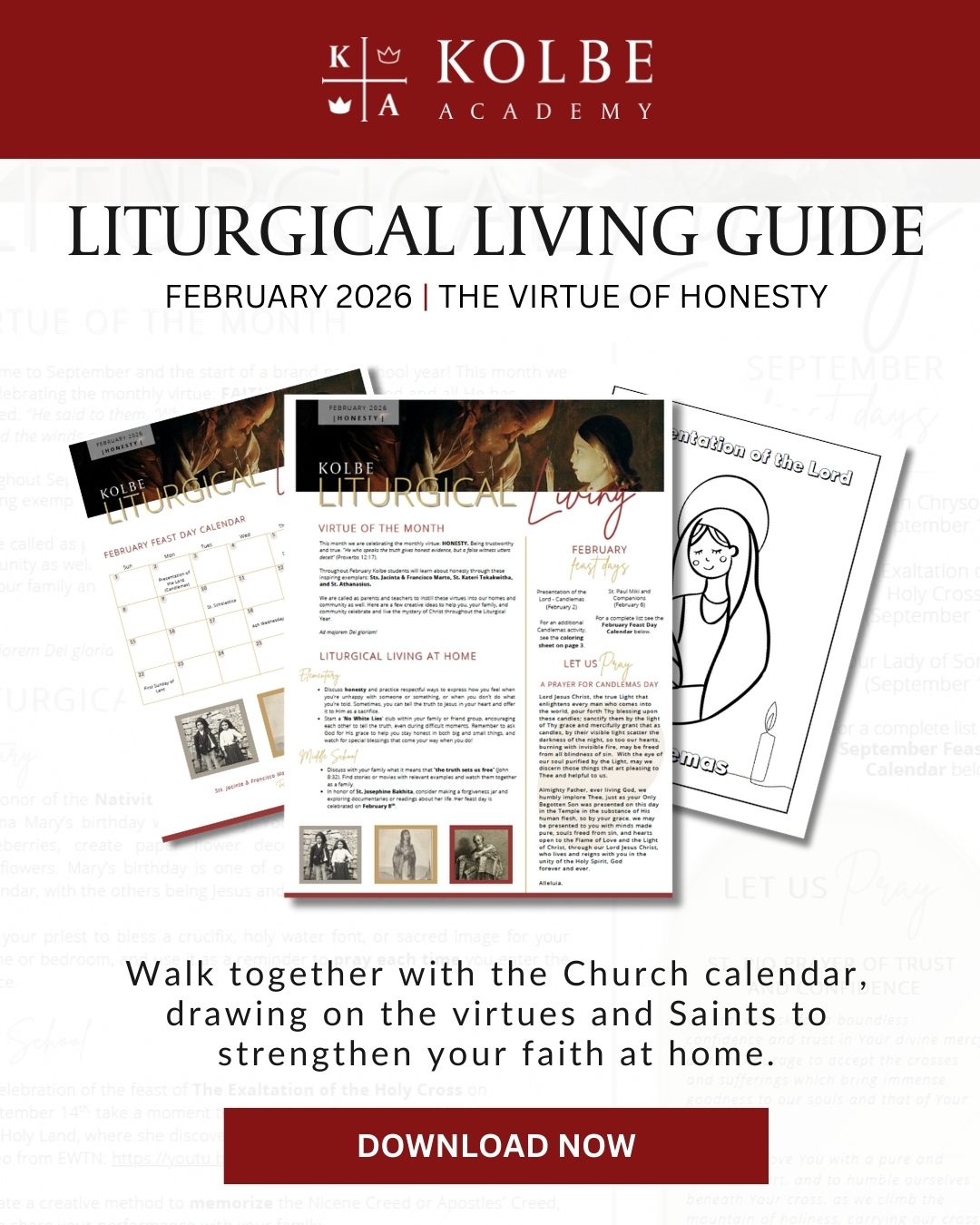 Each month, Kolbe families walk together with the Church calendar, drawing on the virtues and saints to strengthen their faith at home. This month we are celebrating the monthly virtue of: