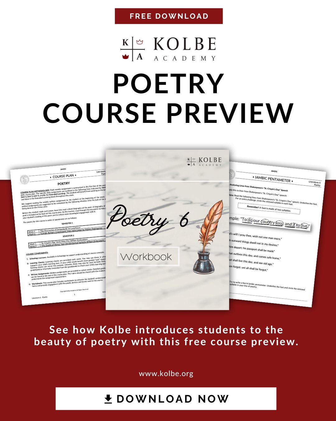 This year Kolbe Academy Press published a collection of poems especially for Catholic, classical homeschoolers. Our carefully curated poetry collection, Classic Poems Across the Ages, offers a rich journey through the great poetic traditions of Western civilization. Currently used in Kolbe Academy’s Junior High Literature program (with some selections also appearing in Literature 6) this volume serves as an inspiring resource for families seeking to cultivate a love for beauty, truth, and the written word.